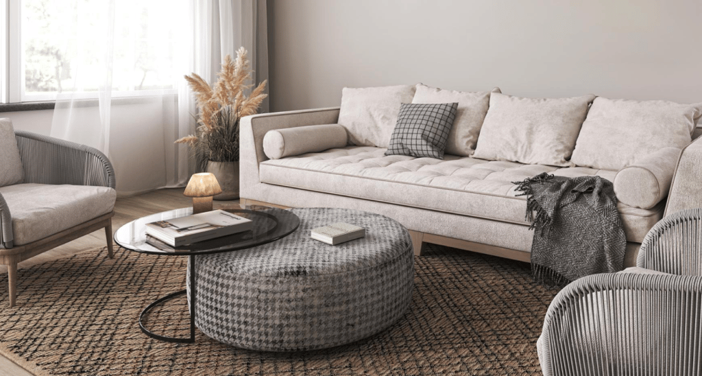 Opt for a larger rug whenever possible — small rugs can visually shrink a room. Soft neutrals, subtle patterns, or earthy tones work well with practically any style and instantly soften hard flooring.
